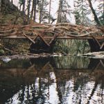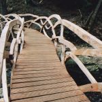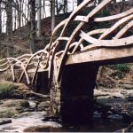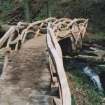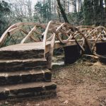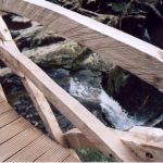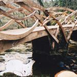 When asked to design a replacement footbridge at Hareshaw Linn, it struck me that the most important and dramatic aspect of the site was the waterfall. So, I proposed to bring the bridge as close to the edge of the waterfall as possible by building three piers, one on either side of the bank, and a central pier in the watercourse of the Linn. These were spanned by an ‘S’ shaped platform that deliberately distracted the visitor from a direct crossing, and invited time and contemplation in taking the elevated traverse. The protective barriers on either side of the bridge were built from solid elm, but cut and fixed together in such a way as to imitate the softness of woven fabric, and the movement of wind and water.