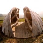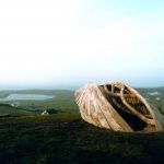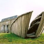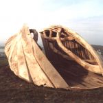 The inspiration for the form of this sculpture originates from the shells that scatter the shoreline, from the ever present movement of wind and waves, and from the hulls of the original clinker built boats that the community once fished from, and which can still be occasionally seen about the islands. It creates an interior space of quiet and stillness from the wind, in a cocoon of weaving timbers that imitate the movement of submerged fronds of sea kelp. The distant shoreline is framed by the internal faces of the cocoon, having the effect of drawing the magnified seascape into the interior space.
